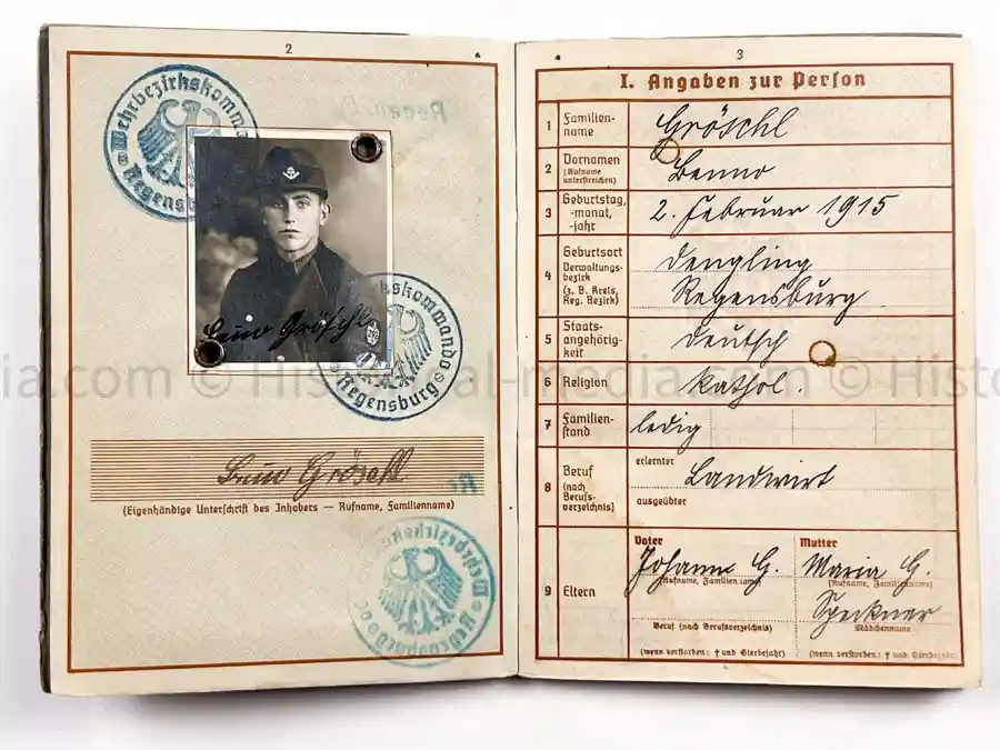 Heer Wehrpass issued to Stabsgefreiter Benno GRÖSCHL. He served in Artillerie Regiment 10 of the 10. Infanterie Division and then GEBIRGS ART. RGT. 95 of the 5. GEBIRGS DIVISION . ID photo shows him in RAD uniform. Also comes with some additional paperwork. Fantastic campaign entries for the POLAND CAMPAIGN 1939 as well as France 1940, then the BALKANS & GREECE and finally RUSSIA. The 5. Gebirgs Division was much action in WOLCHOW & LENINGRAD.