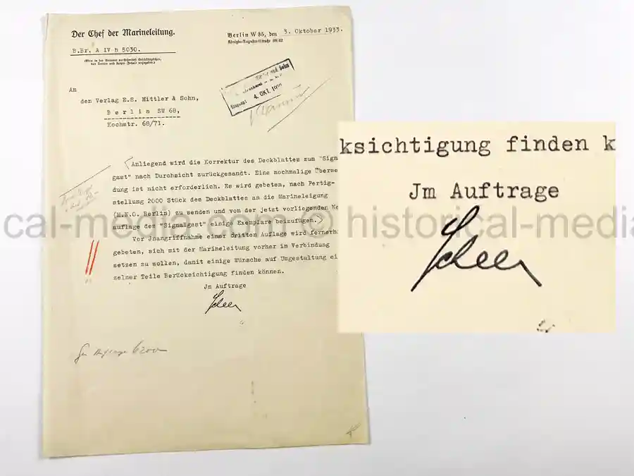 “The corrected cover sheet for the “Signalgast” is being returned herewith following review. A second submission is not required. Upon completion, you are requested to send 2,000 copies of the cover sheet to the Naval Command (M.N.O. Berlin) and to enclose several copies of the current new edition of the “Signalgast.”
