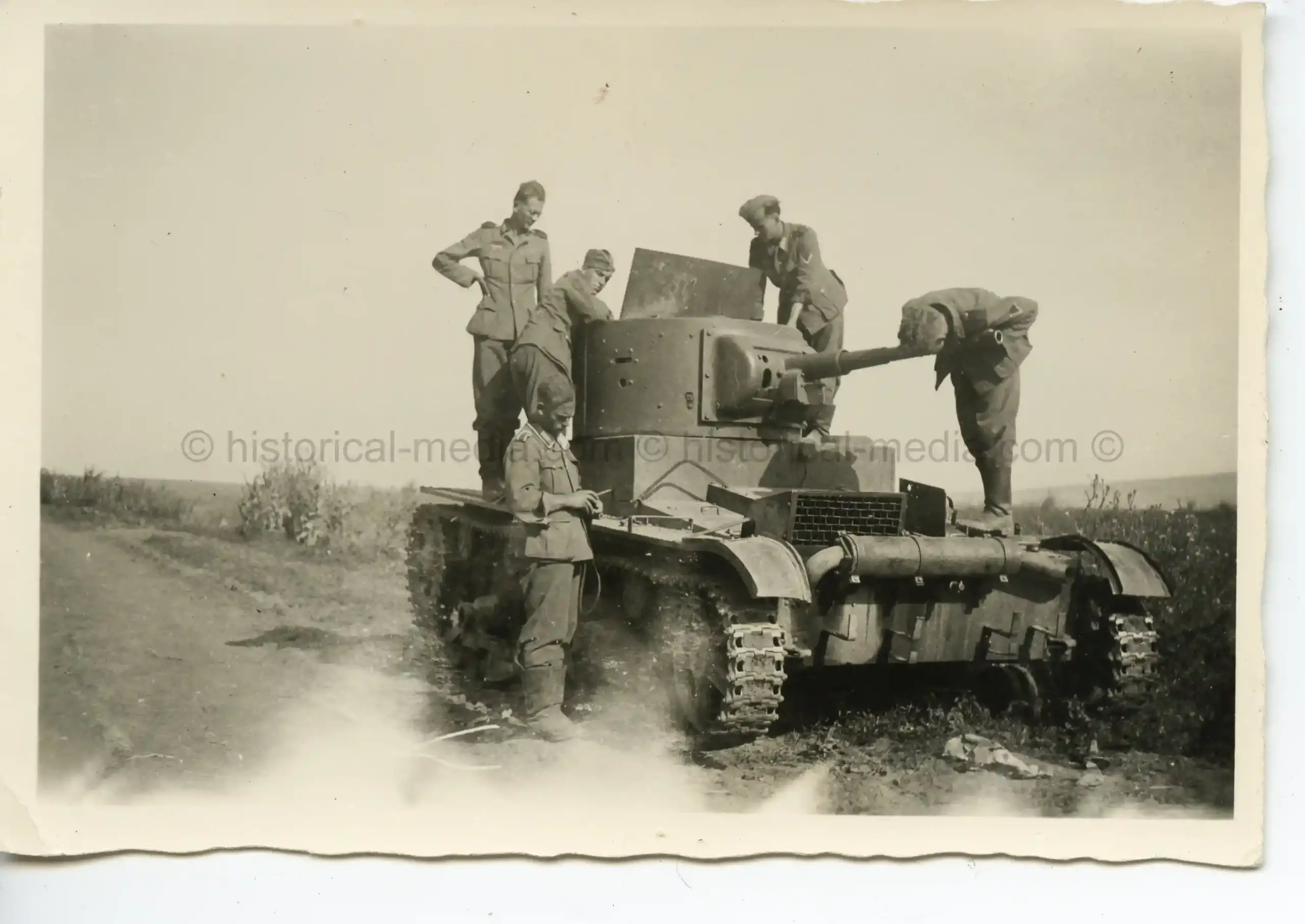 PHOTO OF GERMAN SOLDIER SINSPECTING RUSSIAN T-26 TANK