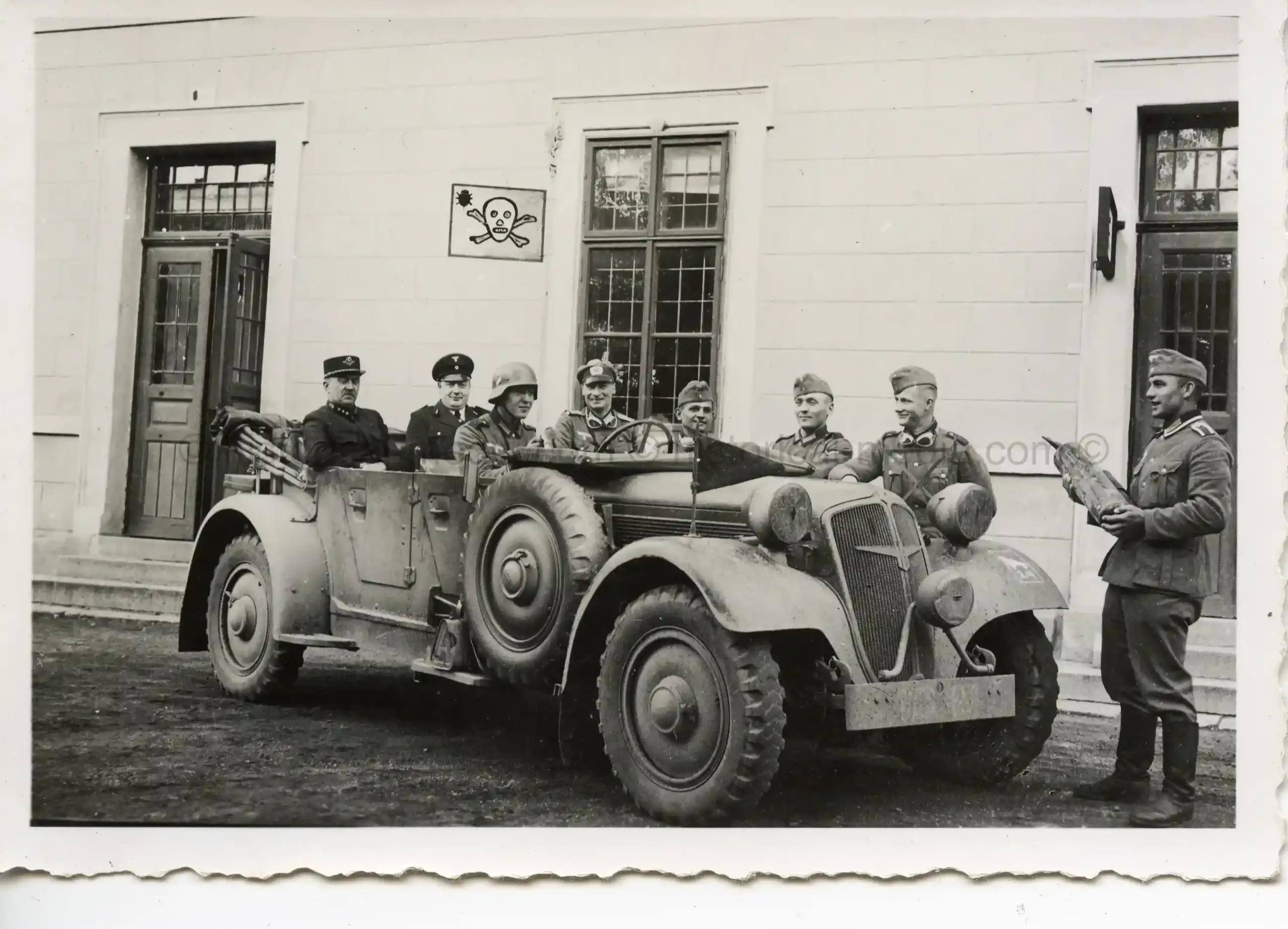 PHOTO OF GERMAN SOLDIERS IN ADLER 3 GD CAR + TOTENKOPF INSIGNIA