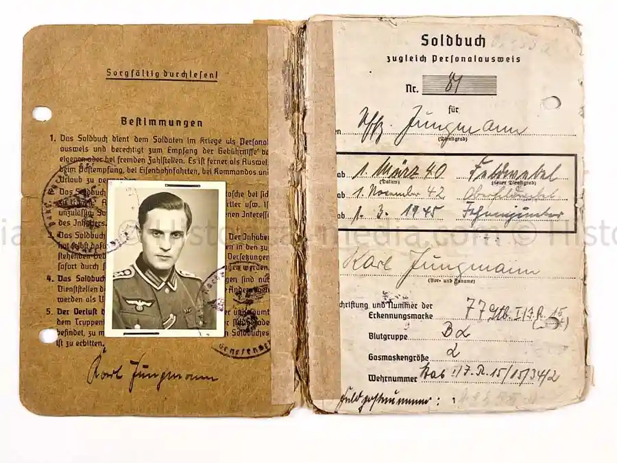 Soldbuch issued to Fahnenjuncker Karl JÜNGMANN. Soldbuch was issued November 19, 1939 when he was assigned to Inf. Rgt. 15 (mot.). Has a beautiful ID photo of him as an Oberfeldwebel. He was awarded the Long Service Medal IV Class, War Merit Cross 2nd Class, 1939, Iron Cross 2nd Class, and the Wound Badge in Silver. He spent most of his service with Inf. Rgt. 15 (mot.) which was part of 29. Infanterie-Division “FALKE” which was later destroyed at STALINGRAD. He clearly survived the destruction due to being wounded in 1942, was later sent to a training unit after recovery and then transferred to PANZER VERNICHTUNGS BRIGADE “MECKLENBÜRG” at war’s end during the desperate months resulting in combing out training and replacement units as well as youth organizations and veterans for fire brigade formations. History of this unit is shadowy but appears to be associated with Panzervernichtungs-Brigade Hitlerjugend.