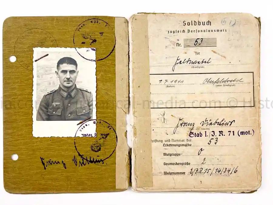 Heer SOLDBUCH issued to Oberfeldwebel Franz DIEBELIUS. Soldbuch was issued August 23, 1939 when he was assigned to Inf. Rgt. 71 (mot.) which was part of 29. Infanterie-Division “FALKE” which was later destroyed at STALINGRAD. Awards entered include Long Service Medal, KVK2, Sudetenland Campaign medal, Ostmedaille. He was also issued an MP 40. Hospitalizations pages (11-14)appear missing but we can deduce from his clothing issue pages that he was hospitalized in 1942 which led to him missing the catastrophe of the division at STALINGRAD and stayed with the unit after its reforming in 1943. Interesting he served in the redesigned Panzer Grenadier Regiment 71 in the 13. Kompanie – (s.I.G. S.f.) – heavy self motorized anti personnel artillery. Selbstfahrlafette means self-propelled. This could represent several types of tracked vehicles like the Sturm-Infanteriegeschütz 33B (sIG 33B) of possibly StuG III’s.