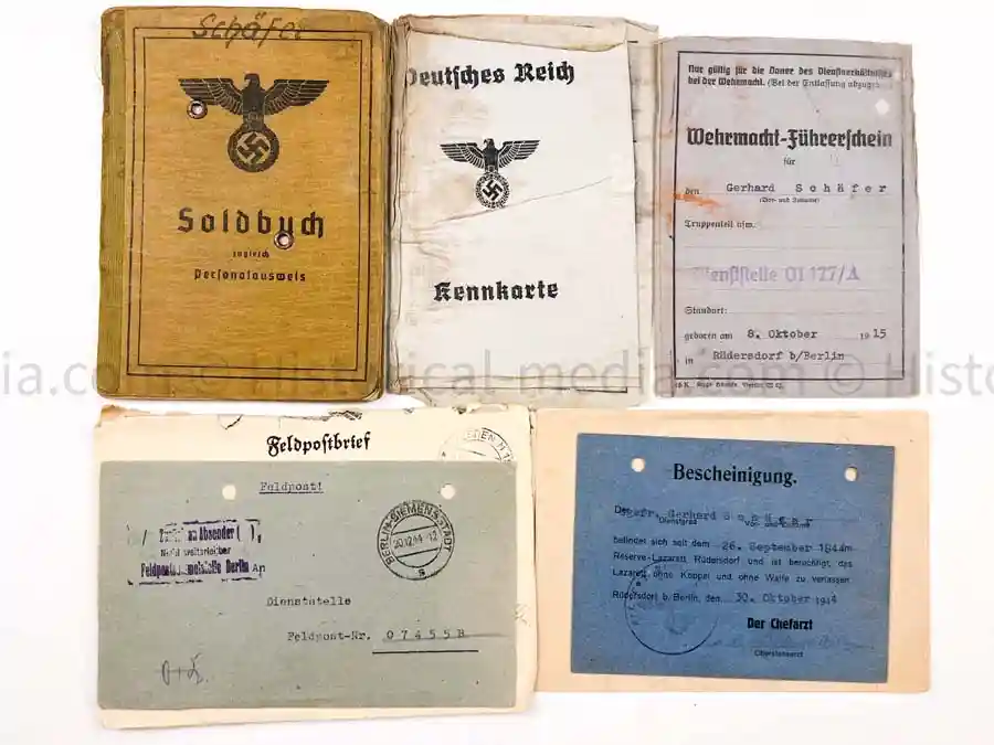 HEER Soldbuch ISSUED to Obergefreiter Gerhard SCHÄFER, who served most of his service in Panzer Grenadier Regiment 3 of the 3. PANZER DIVISION. lastly in the I./Pz.Gren.Rgt. “Oder” and and 4./Volksgrenadier Regiment 1092 of the 547. Volks-Grenadier-Division. SOLDBUCH ISSED MAY, 24, 1943. original uniform photo showing him wearing Ostmedaille ribbon. Many entries, including his awards as Infantry Assault Badge in Silver, Wound Badge in Black, East Medal, and Iron Cross 2nd Class – interestingly awarded by Wehrmachtskommandantur Berlin on October, 9, 1944. He was KIA May 15, 1945.