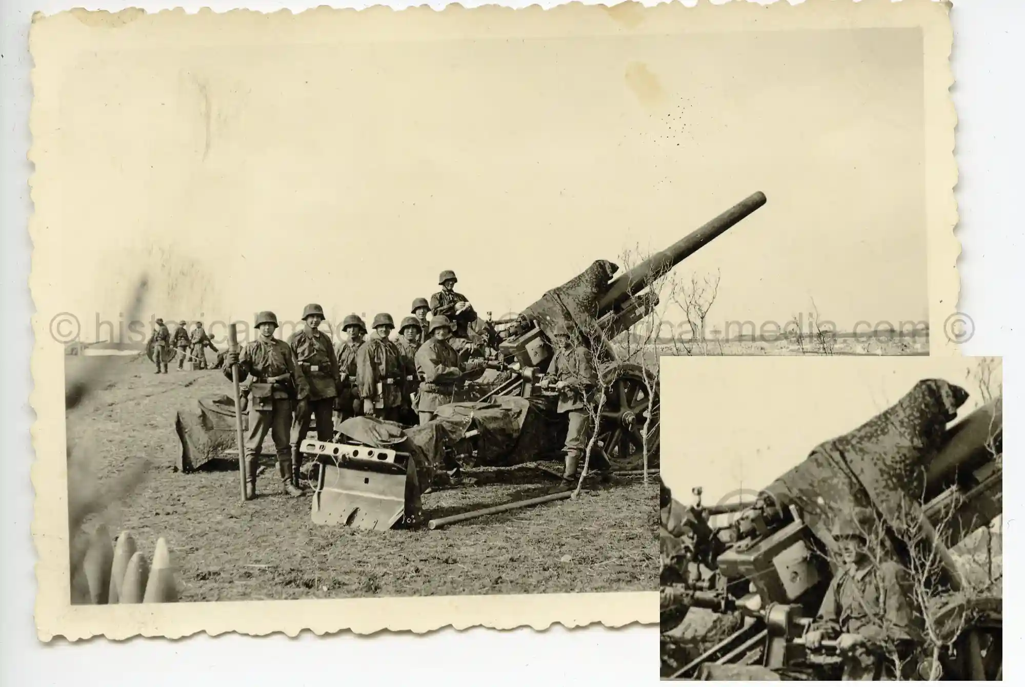 WAFFEN-SS PHOTO – WIKING SOLDIERS IN CAMO SMOCKS POSE BY ARTILLERY CANNON (SS CAMO CLOTH OVER CANNON)
