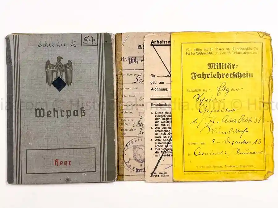Heer Wehrpass issued to Stabsschirrmeister Edgar SCHRÖDER. He served in Panzer Regiment 11, Inf. Rgt 114, Gre, Rgt. 1031, Panzer Gren. Rgt. 128. Awards entered include Long Service Medal 4th Class, Sudetenland Campaign medal, Black Wound Badge, and KVK2. Also comes with his Militär Fahrlehrschein (Driver’s Training License). Great uniform ID photo – uncommon for a Wehrpass. Great campaign entries for the Poland Campaign of 1939, FRANCE 1940, as well as RUSSIA. Campaign entries continue through 1944 and 1945!!