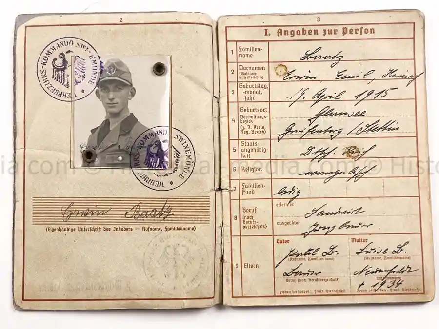 Heer Wehrpass issued to Wachtmeister Erwin BAATZ. He served in Auklarungs Abteilung 32 of the 32. Infanterie Division. In August 1943 he transferred to Kav. Rgt. “NORD.” His last unit in 1944/45 was Kav. Rgt. 5. Awards entered include the KVK2, Ostmedaille and DEMJANSKSCHILD! Nice ID photo showing him wearing RAD uniform. Good campaign entries for the invasion of POLAND 1939, campaign entries for FRANCE 1940, many entries for RUSSIA, also ANTI-PARTISAN Operations in 1944 – “Kampfe met Banden.”