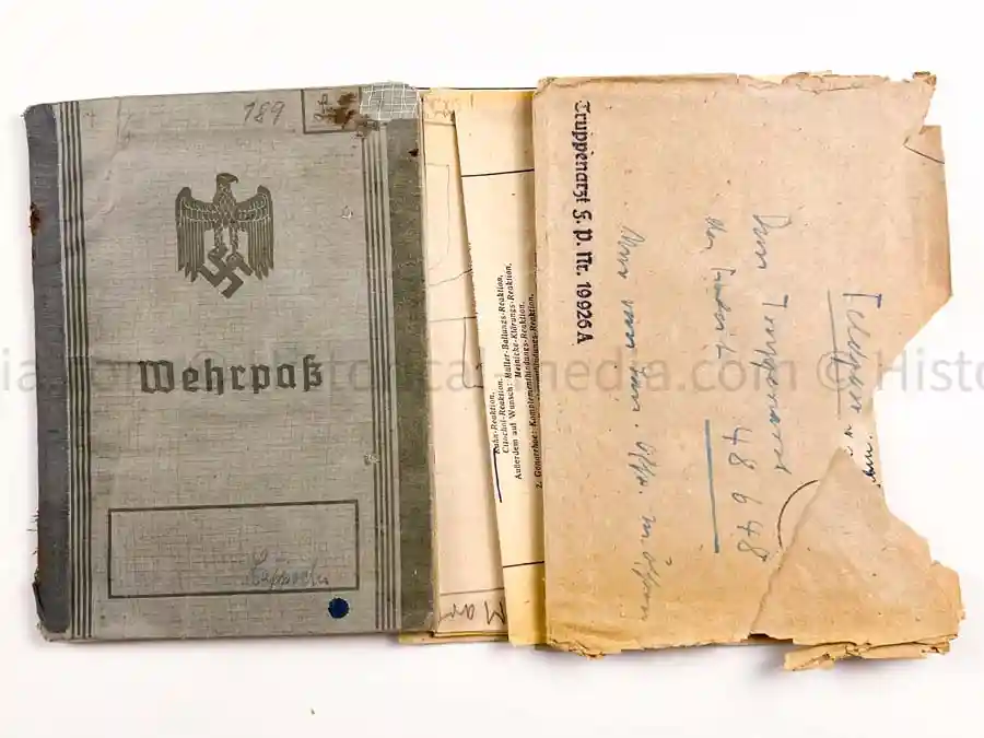 Heer Wehrpass issued to Wachtmeister Bruno LAPPREHN. He served in Art. Rg.t 161, 290 and later Here Küsten Batt. 561 and 599. His last unit was Festungs Oak Komp/ 5./VII. Campaign entry for the Poland Campaign 1949, France 1940 and then stationed on Coastal Protection duty in NORWAY with Heeres-Küst.-Artl.-Abt. 499 (Heeres-Küst.-Artl.-Batt. 561). Also comes with additional paperwork.