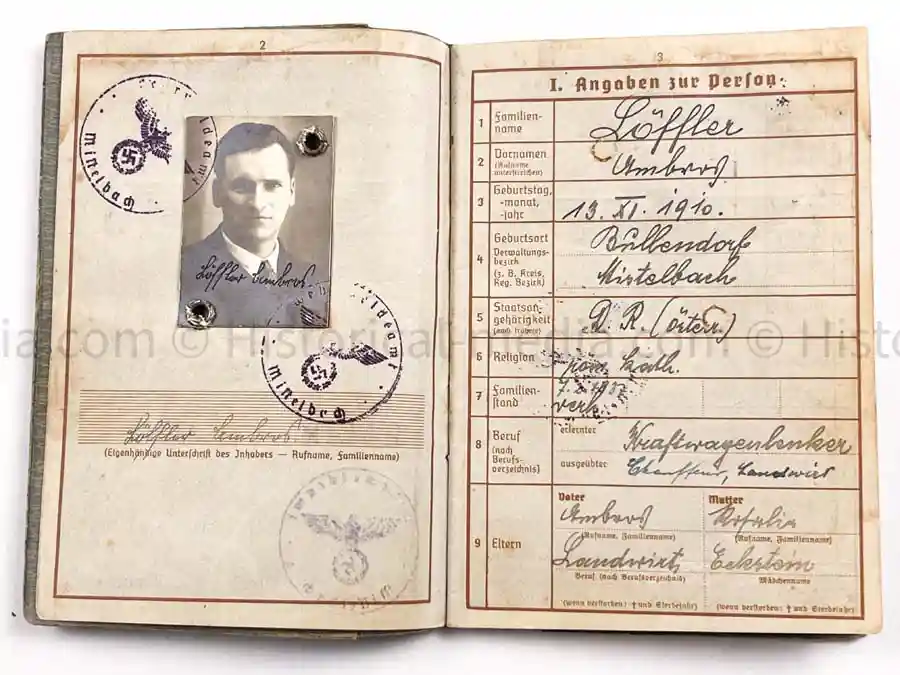 Heer Wehrpass issued to Stabsgefreiter Ambros LÖFFLER. He served in Eisenbahn Pionier Bat. 56 during the Poland Campaign of 1940. His campaign entries interestingly list “GEFECHT IN AUSCHWITZ.” Awards entered include Ostmedaille and KVK2.