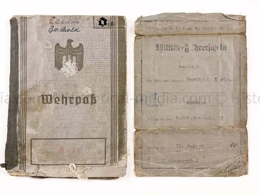 Heer Wehrpass issued to Oberwachtmeister Berthold DIETRICH. He served in GEBIRGS KRADSCHÜTZEN SCHWADRON 54 of the 1. GEBIRGS DIVISION. Nice ID photo showing the man in uniform with clear “P 37” shoulder boards for Panzer Abwehr Abt. 37. Awards entered include Sudetenland Campaign Medal, KVK2, and Ostmedaille. Also comes with his Military Driver’s License (Führerschein) with ID photo. Extensive weapons training entries including the Granatwerfer 34 mortar. Campaign entries include SUDETENLAND, good entries for POLAND 1939, then FRANCE 1940 and RUSSIA.