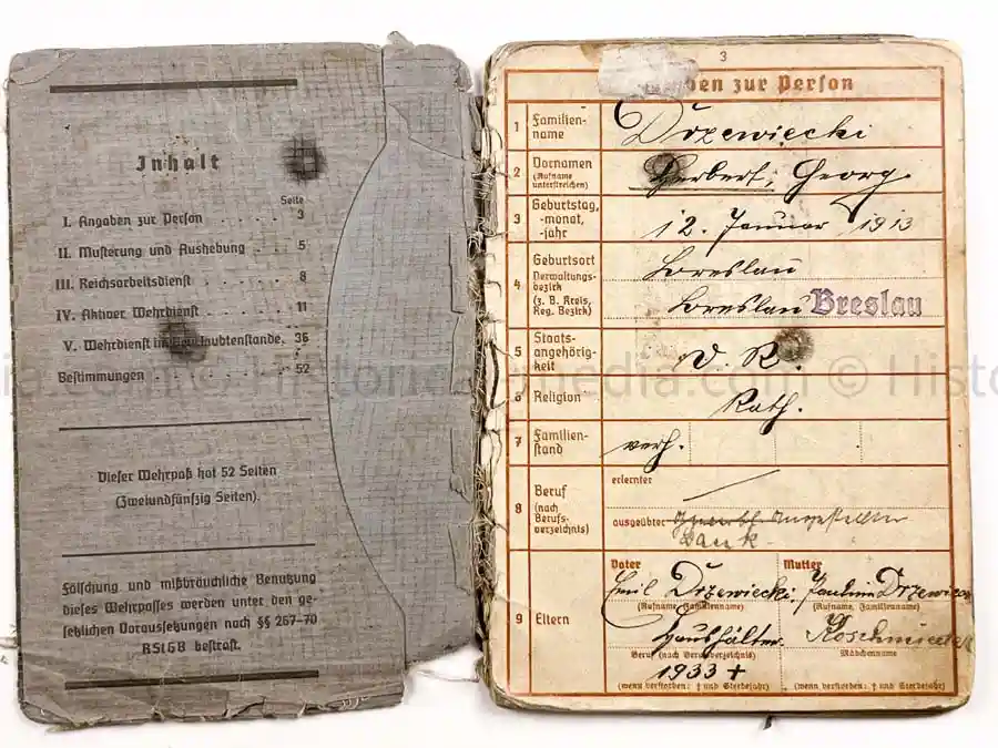Heer Wehrpass issued to Herbert DRZEWIECKI. He served in Panzer Regiment 201 and later the Stabdkompanie of Panzer Abteilung 211. He also served in Landwehr Inf. Rgt. 183 during the POLAND campaign of 1939. Pages 1-2 missing. Campaigns listed for POLAND 1939 and occupation in France 1940-1941.