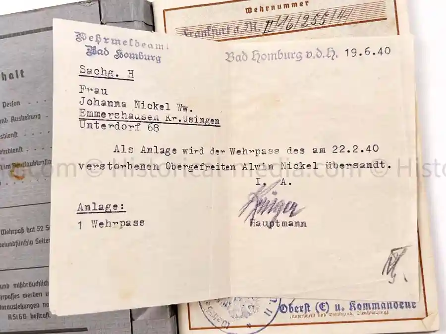 Heer Wehrpass issued to Obergef. Alwin NICKEL. He served in Pionier Bataillon 49 of the 10. Panzer Division. Award for the West Wall Medal entered. The battalion participated in the Polenfelszug (Polish Campaign).