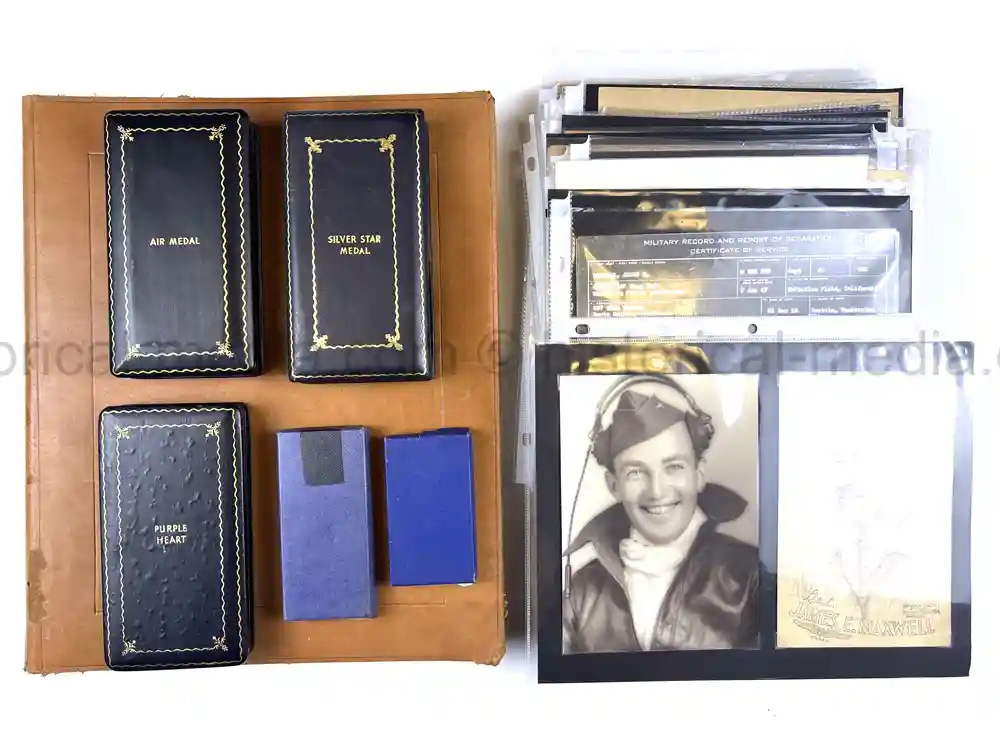 Extensive grouping named to Lt. James E. MAXWELL. He served as a B-26 pilot in the 386th Bomb Group, 55th Bomb Squadron. He was shot down on November 18, 1944 near Beaumont-sur-Oise, France. Comes with all of his original WWII issued medals. Many original Kriegsgefangenpost – POW letters – he sent home from POW camp in Stalag Luft III. Massive amount of material. Great pencil portrait done in POW camp, also comes with his original POW CAMP PERSONALKARTE (very desirable). Large scrapbook filled with more photos and documents. Comes with all of his medal citations! Telegrams, newspaper clippings about his post-war military service, and more!